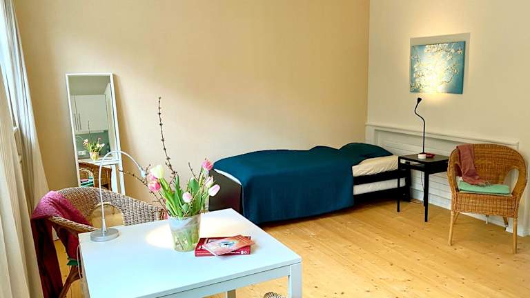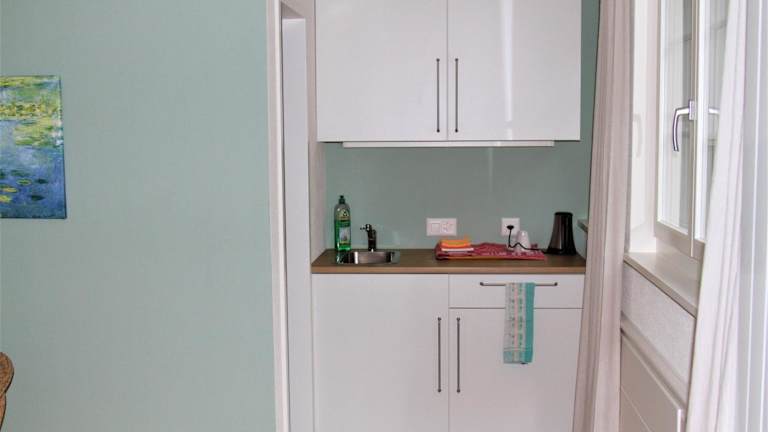 Die Ferienwohnung bietet ein Schlafzimmer sowie eine voll ausgestattete Küchenzeile mit Kühlschrank. Außerdem ist ein Badezimmer mit Dusche und Haartrockner vorhanden. Handtücher und Bettwäsche werden bereitgestellt.