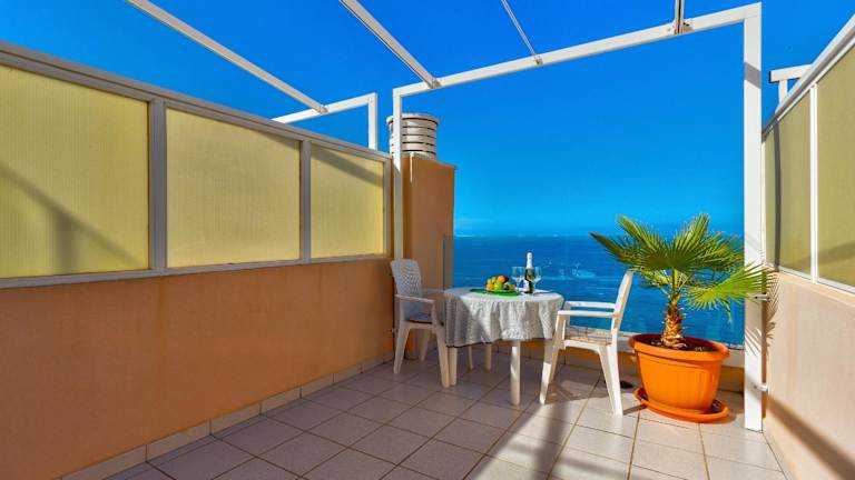 Die Ferienwohnung verfügt über ein Schlafzimmer, ein Badezimmer, eine voll ausgestattete Küchenzeile und einen Essbereich. Zur Ausstattung gehören ein Flachbild-TV, Bettwäsche und Handtücher. Ein Balkon mit Blick auf das Meer ergänzt die Räumlichkeiten.