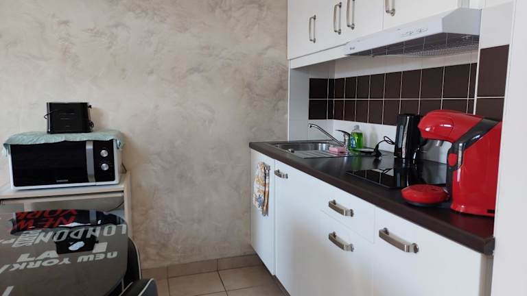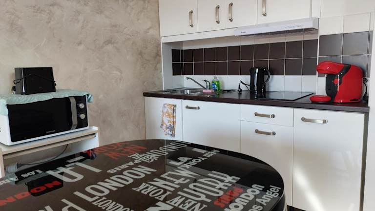 Die Ferienwohnung ist mit einem Flachbild-TV ausgestattet. Die Küchenzeile umfasst einen Kühlschrank, eine Mikrowelle, eine Herdplatte, eine Kaffeemaschine und einen Wasserkocher.