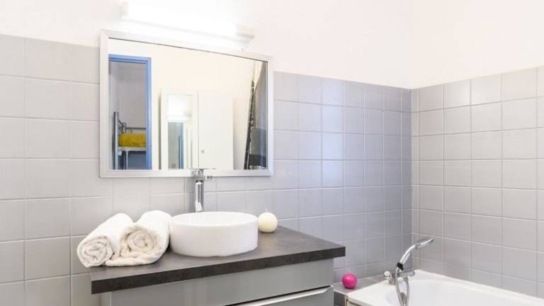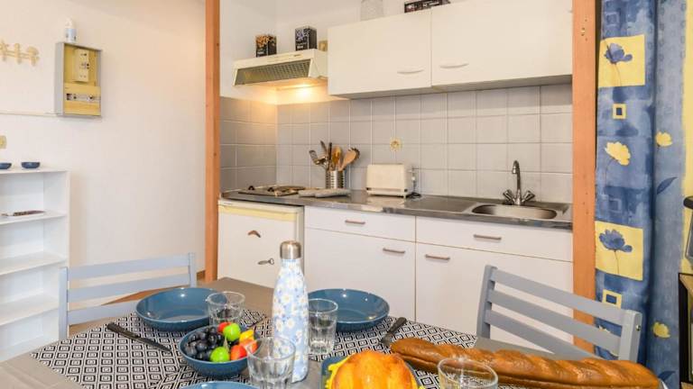 Die Ferienwohnung verfügt über eine Küchenzeile, die mit einem Kühlschrank, einem Ofen, einer Mikrowelle sowie einer Kaffeemaschine ausgestattet ist. Die Schlafbereiche sind teilweise offen gestaltet, ohne eine abgeschlossene Schlafzimmerstruktur. Bettwäsche und Handtücher werden nach den Vorschriften der örtlichen Behörden gewaschen.