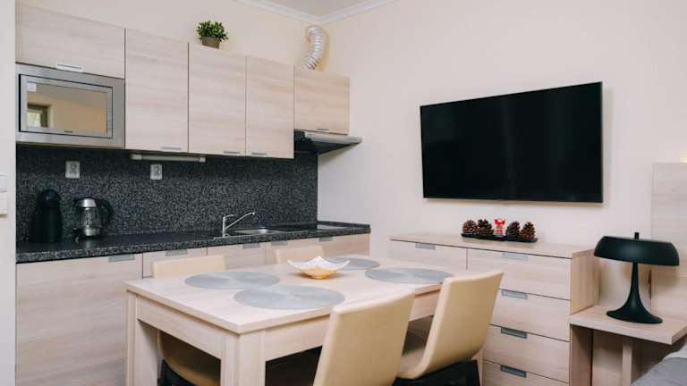 Die Ferienwohnung ist mit einem Fernseher ausgestattet. Die Küchenzeile beinhaltet einen Kühlschrank, eine Mikrowelle, eine Herdplatte sowie eine Kaffeemaschine.