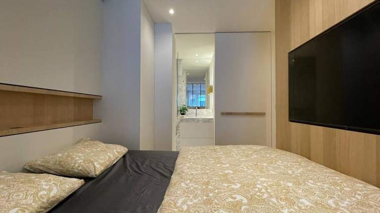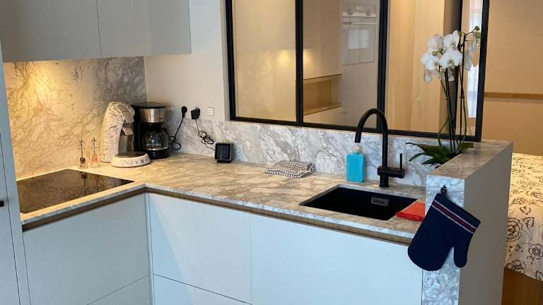Die Ferienwohnung umfasst ein Schlafzimmer, eine Küche, einen Sitzbereich sowie ein Badezimmer. Handtücher und Bettwäsche werden bereitgestellt. Die Küchenausstattung umfasst einen Geschirrspüler und einen Ofen.