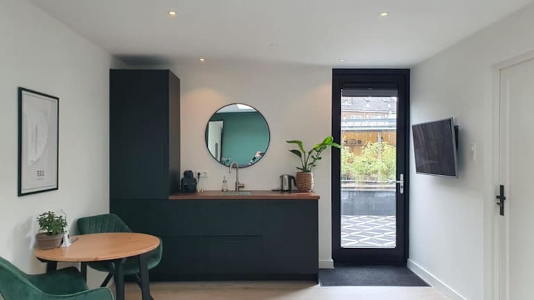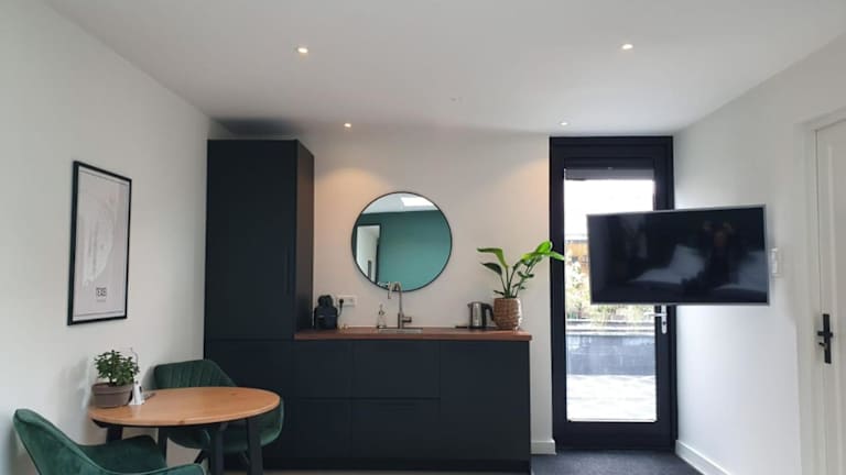 Das Studio Smidt bietet ein gemütliches Schlafzimmer und ein modernes Badezimmer. Die Unterkunft ist mit Bettwäsche und Handtüchern ausgestattet und verfügt über einen Flachbild-TV für Ihre Unterhaltung. Der Essbereich bietet Platz für gemeinsame Mahlzeiten und die voll ausgestattete Küchenzeile ermöglicht es Ihnen, Ihre eigenen Mahlzeiten zuzubereiten. Genießen Sie den Blick auf den Garten von Ihrer eigenen Terrasse.