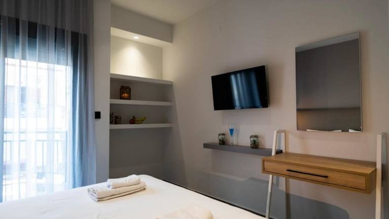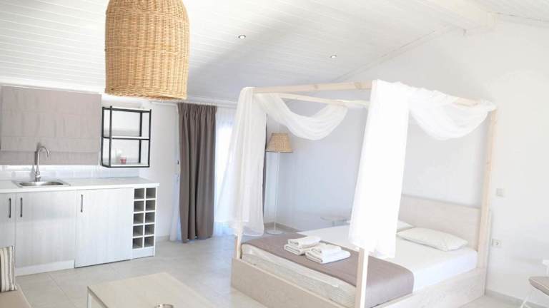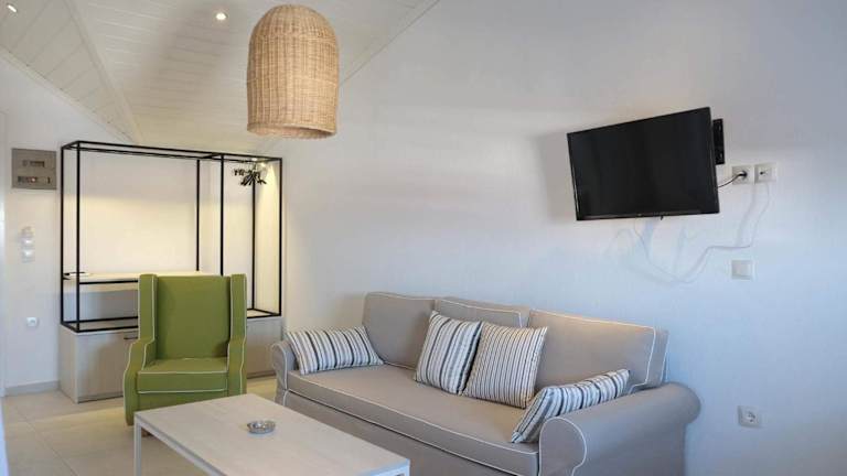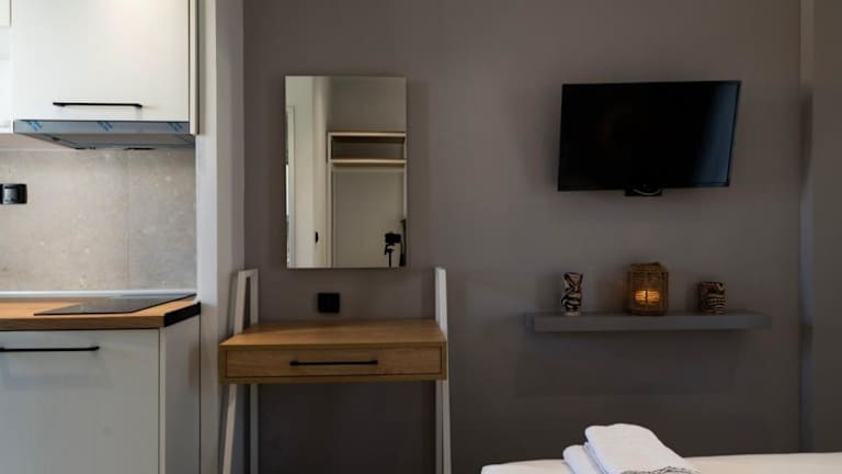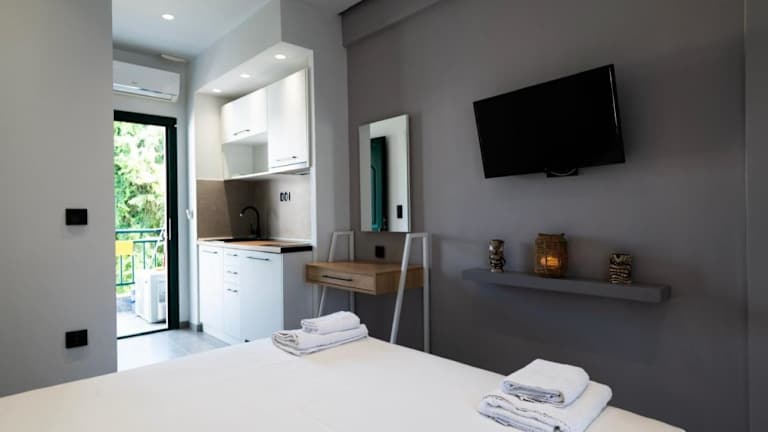 Die Unterkünfte im Studio Theano sind komfortabel und mit Klimaanlage und einem Flachbild-TV ausgestattet. Hier können Sie sich nach einem langen Tag am Strand oder beim Erkunden der Umgebung entspannen.