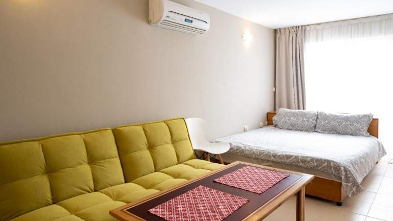 Die Ferienwohnung verfügt über ein Schlafzimmer, ein Badezimmer, Bettwäsche, Handtücher, einen Flachbild-TV mit Satellitenkanälen, einen Essbereich, eine voll ausgestattete Küche sowie eine Veranda oder ein Patio mit Stadtblick. Für zusätzlichen Komfort können Handtücher und Bettwäsche gegen Aufpreis bereitgestellt werden. Schallisolierte Zimmer sind ebenfalls vorhanden.