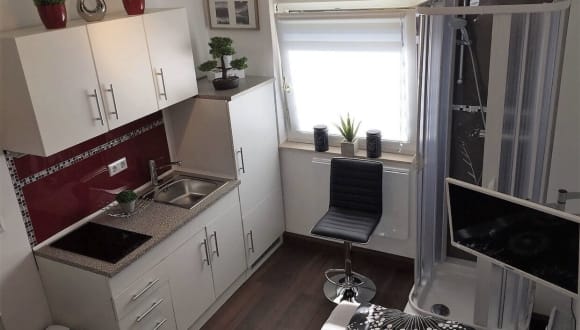 Das Apartment umfasst 1 Schlafzimmer, eine Küchenzeile mit Kühlschrank und Mikrowelle sowie 1 Badezimmer mit Dusche. Handtücher und Bettwäsche sind ebenfalls vorhanden.