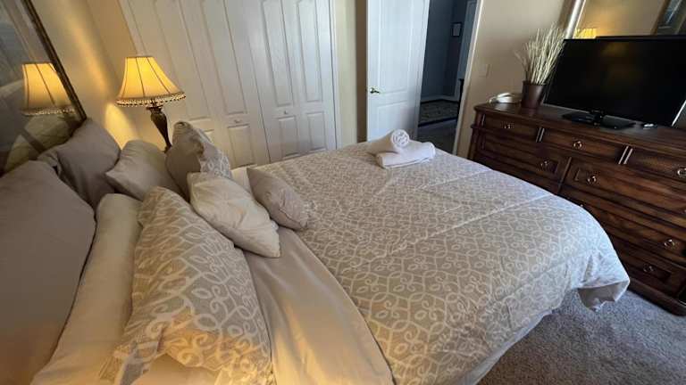 Die klimatisierte Villa verfügt über drei geräumige Schlafzimmer, in denen Sie sich nach einem aufregenden Tag in Orlando entspannen können. Die Unterkunft bietet auch einen TV und eine voll ausgestattete Küche mit einem Geschirrspüler und einer Mikrowelle. Das kostenfreie WLAN in allen Bereichen ermöglicht es Ihnen, mit Ihren Lieben in Verbindung zu bleiben und Ihre Erlebnisse in Orlando zu teilen.
