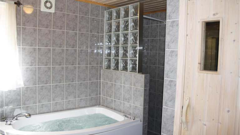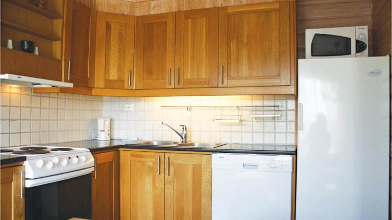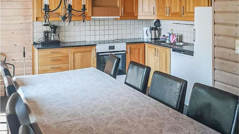 Das Ferienhaus verfügt über ein Wohnzimmer und eine voll ausgestattete Küche. In der Küche sind ein Kühlschrank und ein Geschirrspüler vorhanden.