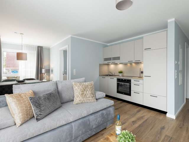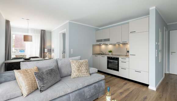 Die Ferienwohnung umfasst ein Schlafzimmer, ein Wohnzimmer und einen Balkon. Die Küche ist mit einem Geschirrspüler und einem Ofen ausgestattet.