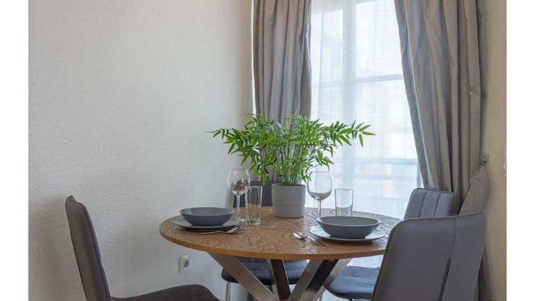 Die Ferienwohnung verfügt über eine voll ausgestattete Küche mit Kühlschrank, Geschirrspüler und Ofen, sowie einen Essbereich im Wohnzimmer. Es sind keine speziellen Verpflegungsmöglichkeiten oder Restaurants angegeben.