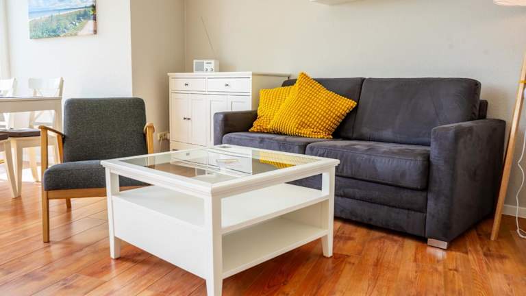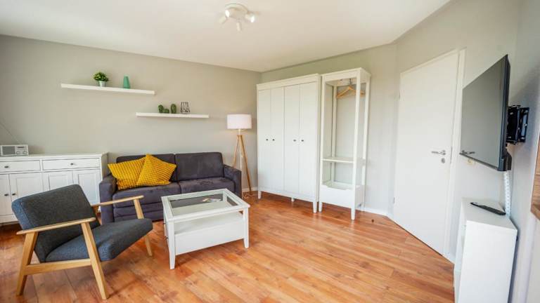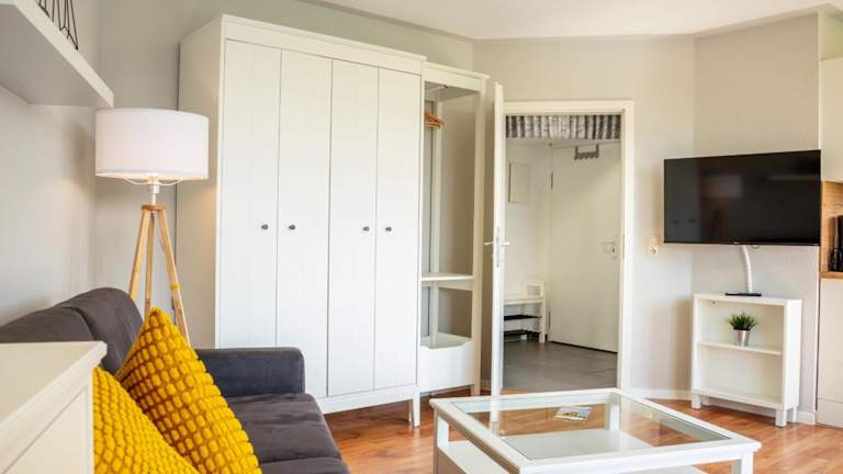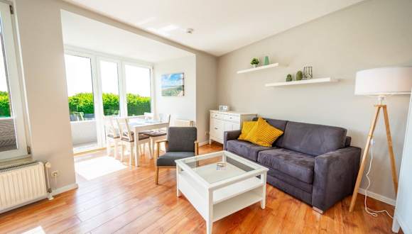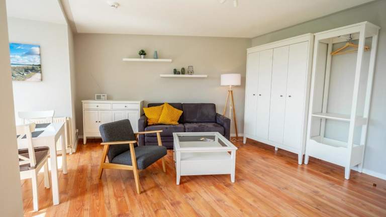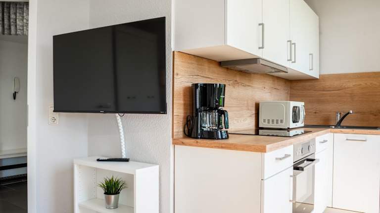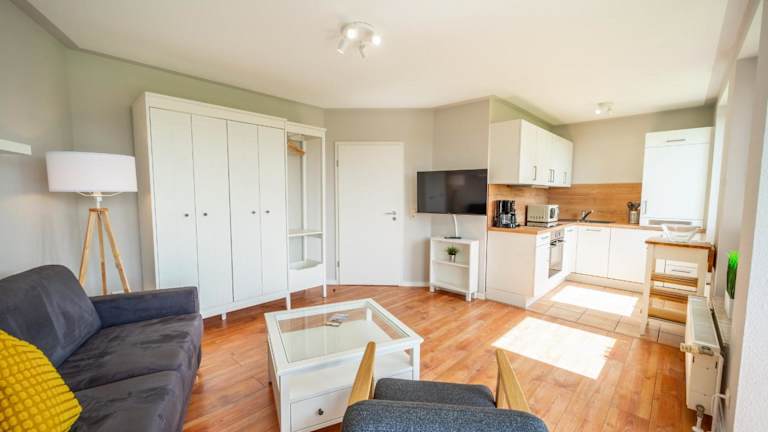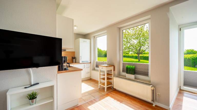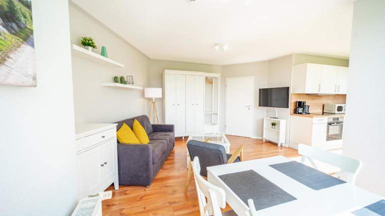 Die Wohnung verfügt über ein Schlafzimmer und ist ausgestattet mit einem TV mit Kabelkanälen sowie einer voll ausgestatteten Küche. Diese beinhaltet einen Kühlschrank, Geschirrspüler, Waschmaschine, Ofen und Mikrowelle. Zudem sind Gartenmöbel vorhanden. Es wird darauf hingewiesen, dass Bettwäsche und Handtücher nicht im Übernachtungspreis enthalten sind und separat gemietet werden müssen.