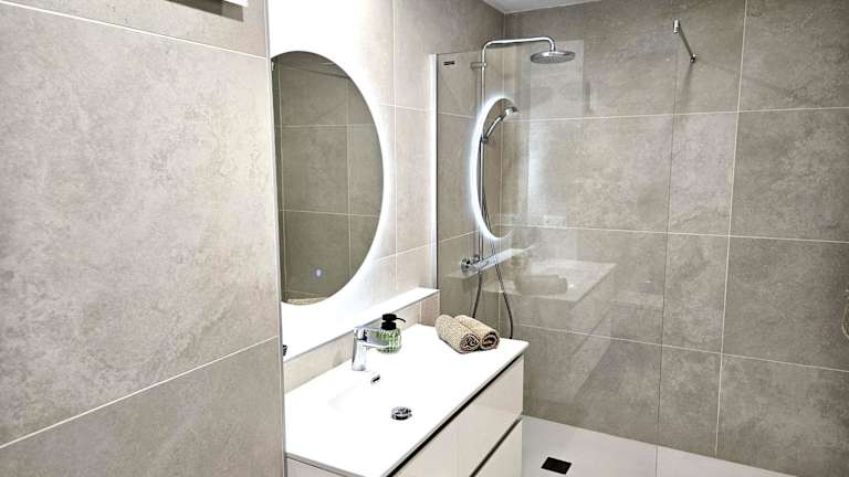 Die Ferienwohnung bietet ein Schlafzimmer, ein Wohnzimmer und einen Balkon mit Meerblick. Zur Ausstattung gehören ein Flachbild-TV und eine gut ausgestattete Küchenzeile mit Kühlschrank und Ofen. Des Weiteren gibt es ein Badezimmer mit Dusche, in dem Handtücher und Bettwäsche bereitgestellt werden.