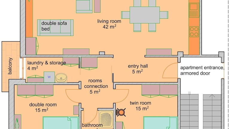 Die Unterkunft verfügt über eine voll ausgestattete Küche mit Kühlschrank und Kaffeemaschine, zwei Schlafzimmer, ein Wohnzimmer sowie ein Badezimmer mit Bidet und Dusche. Des Weiteren sind ein Flachbild-TV mit Satellitenkanälen und ein CD-Player vorhanden. Gäste können ihre eigenen Bettwäsche und Handtücher mitbringen oder diese gegen Gebühr vor Ort mieten.