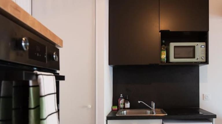 Die Unterkunft umfasst eine Küche mit Ausstattung wie Kühlschrank, Mikrowelle, Toaster, Kaffeemaschine und Wasserkocher, die die Selbstversorgung ermöglicht.