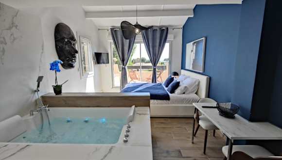 Das Suites JM - Les Pins Marines - Jacuzzi & Vue Mer ist ein charmantes Hotel in Bandol, nur wenige Gehminuten von den schönen Stränden Capelan und Engraviers entfernt. Die klimatisierten Unterkünfte bieten kostenfreies WLAN, eine Terrasse und eine Bar. Genießen Sie den Whirlpool im Apartment und erkunden Sie die Umgebung mit Aktivitäten wie Wandern, Tauchen und Angeln. Kostenlose Privatparkplätze stehen zur Verfügung.