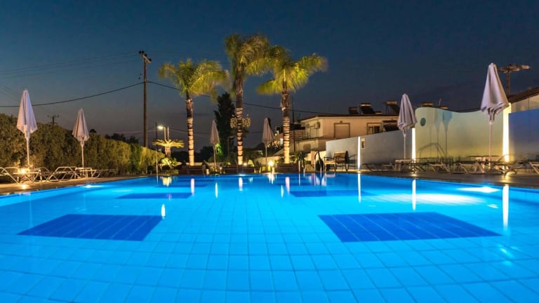 Das Hotel verfügt über einen Außenpool mit Sonnenliegen und eine Sonnenterrasse, auf der Sie sich entspannen können. Ein gepflegter Garten lädt ebenfalls zum Verweilen ein. In der Umgebung können Sie den Strand von Faliraki besuchen oder den Wasserpark von Rhodos erkunden.