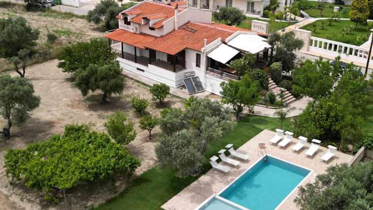 Die Villa umfasst 4 Schlafzimmer und ein Wohnzimmer. Eine voll ausgestattete Küche mit Kühlschrank und Kaffeemaschine ist vorhanden, ebenso wie ein Badezimmer mit Bidet und Dusche. Handtücher und Bettwäsche werden bereitgestellt.