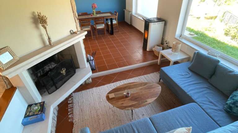 Das Ferienhaus umfasst zwei Schlafzimmer, ein Wohnzimmer, eine voll ausgestattete Küche mit Kühlschrank und Kaffeemaschine sowie drei Badezimmer, die mit einem Bidet und einer Dusche ausgestattet sind. Handtücher und Bettwäsche werden bereitgestellt.