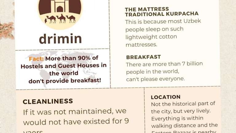 Das DRIMIN by sunrise caravan - Family boutique guesthouse in Taschkent bietet seinen Gästen eine gemütliche und komfortable Unterkunft mit kostenfreiem WLAN und kostenfreien Privatparkplätzen. Das freundliche Personal spricht Englisch und Russisch und steht Ihnen gerne mit Informationen zur Umgebung zur Verfügung. Genießen Sie ein leckeres Frühstück und nutzen Sie die verschiedenen Annehmlichkeiten wie den Garten, die Gemeinschaftslounge und die Terrasse. Der internationale Flughafen Islam Karimov Taschkent ist nur 6 km entfernt, und ein kostenpflichtiger Flughafentransfer wird angeboten.