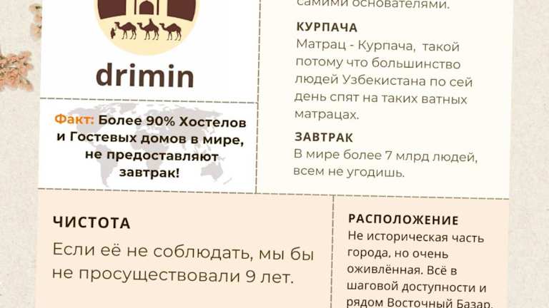 Das DRIMIN by sunrise caravan - Family boutique guesthouse befindet sich in Taschkent und bietet eine günstige Lage für Reisende, die die Stadt erkunden möchten. Die Unterkunft liegt in der Nähe des internationalen Flughafens Islam Karimov Taschkent, was sie zu einem idealen Ausgangspunkt für Reisende macht. In der Umgebung finden Sie verschiedene Sehenswürdigkeiten und Attraktionen, die einen Besuch wert sind.