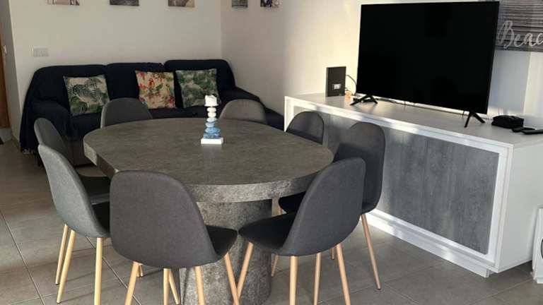 Die Ferienwohnung verfügt über zwei Schlafzimmer, ein Wohnzimmer mit einem Flachbild-TV, eine gut ausgestattete Küche mit Kühlschrank und Geschirrspüler sowie ein Badezimmer mit Bidet. Handtücher und Bettwäsche sind ebenfalls vorhanden. Die Unterkunft bietet eine Terrasse mit Meerblick.
