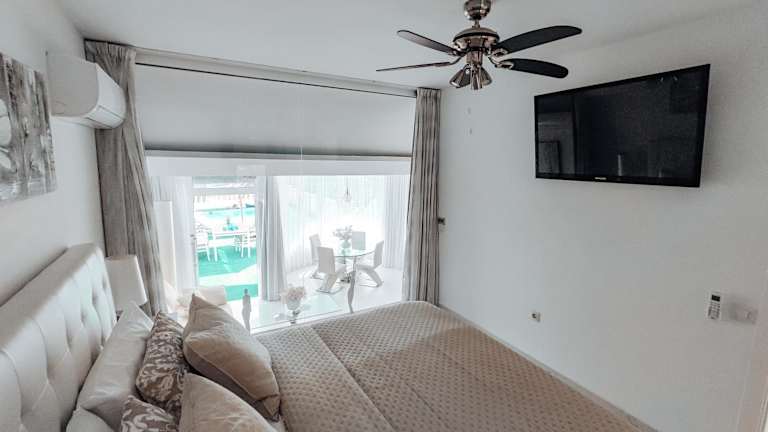 Die Unterkunft bietet eine klimatisierte Villa mit 2 Schlafzimmern, einem Wohnzimmer, einer voll ausgestatteten Küche mit Kühlschrank und Kaffeemaschine sowie einem Badezimmer. Handtücher und Bettwäsche sind vorhanden. Des Weiteren stehen eine Terrasse, Gartenmöbel und ein Außenpool zur Verfügung.