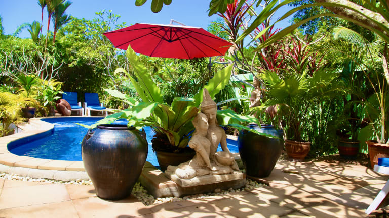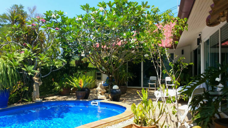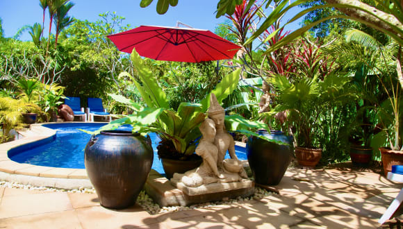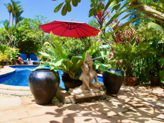 Wohnfläche: Gästehaus insgesamt 160 m², 2 Zimmer a 35 m², 1 Bali Bungalow mit 30 m² Badezimmer: 3 Badezimmer, Badezimmer 1 – geräumig, modernes Interior, WC, Heißwasser-Dusche; Badezimmer 2 – geräumig, modernes Interior, WC, Heißwasser-Dusche; Badezimmer Bali Bungalow – offenes Bad, überdachtes WC, (Heißwasser-)Wasserfall Dusche, Gäste WC im Rezeptionsbreich, alle Badezimmer vermitteln eine angenehme moderne Atmosphäre. Schlafzimmer: 3 Schlafzimmer, Schlafzimmer 1 – 1 großes Doppelbett, Blick auf den tropischen Innenhof, Ensuite-Badezimmer; Schlafzimmer 2 – 1 großes Doppelbett, Blick auf den tropischen Innenhof, Ensuite-Badezimmer; Schlafzimmer Bali Bungalow – 1 großes Doppelbett, Blick auf den tropischen Innenhof, Ensuite-Badezimmer; Schlafzimmer 1-3 haben ihre eigenen Ensuite-Badezimmer. Alle Betten sind mit qualitativ hochwertiger Bettwäsche und Matratzen ausgestattet, um Ihrem Tag einen anagenehmen Ausklang zu bereiten. Internetzugang: Drahtloser W-Lan – kostenfrei, Internet-Anschluss – kostenfrei Außenbereich: Tropischer Innenhof mit gemütlicher Sitzterrasse und Gartenteich mit Wasserfall, Zimmer-Terrassen, direkt angeschlossen Parkmöglichkeit am Grundstück, Swimmingpool Safe Deckenventilatoren Hauspersonal Toilettenpapier Freizeitführer Restaurant-Führer Klimaanlage Handtücher Gefiltertes Wasser Minibar