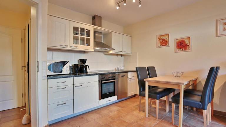Die Ferienwohnung verfügt über eine voll ausgestattete Küche, die einen Kühlschrank, einen Geschirrspüler, eine Waschmaschine, einen Ofen und eine Mikrowelle umfasst. Bettwäsche und Handtücher sind nicht im Zimmerpreis enthalten und können gegen einen Aufpreis ausgeliehen werden.