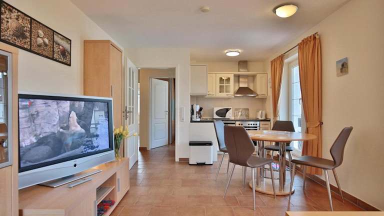Die Sunshine Residenz Appartement 5 bietet eine Ferienwohnung mit komfortabler Ausstattung, darunter ein Wohnzimmer, ein Schlafzimmer sowie eine gut ausgestattete Küche. Zu den Annehmlichkeiten zählen ein Balkon und moderne Unterhaltungsgeräte wie ein TV, Blu-ray-Player, DVD-Player und CD-Player.