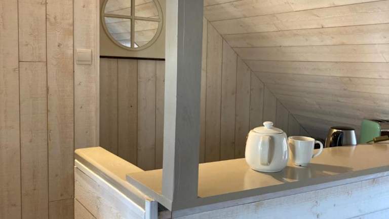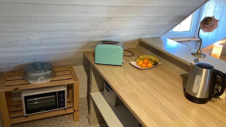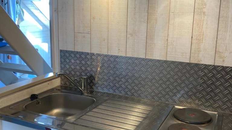 Die Unterkunft enthält eine gut ausgestattete Küchenzeile mit einem Kühlschrank, einem Ofen und einer Herdplatte sowie einen Haartrockner.