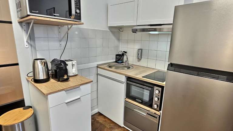 Die Unterkunft verfügt über eine voll ausgestattete Küche mit Kühlschrank und Kaffeemaschine, um Selbstversorger zu ermöglichen. Es sind keine spezifischen Verpflegungsmöglichkeiten angegeben.