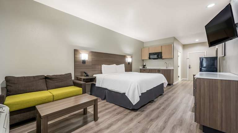 Die 43 klimatisierten Zimmer des Hotels bieten den Gästen eine gemütliche Atmosphäre. Jedes Zimmer verfügt über eine Kochnische mit großem Kühlschrank/Gefrierfach und Herdplatte. Kostenloses WLAN und ein 43-Zoll-LED-Fernseher mit Kabelempfang sorgen für Unterhaltung. Zur Ausstattung gehören auch ein Schreibtisch und eine Mikrowelle. Gäste können kostenlose Ortsgespräche führen.