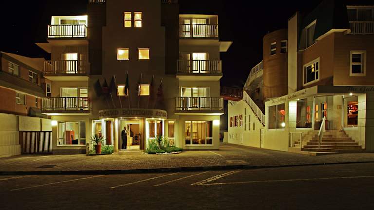 Das Hotel befindet sich im historischen Zentrum von Swakopmund, an der Sam Nujoma Avenue. In der Nähe liegen die Promenade, der Strand, Geschäfte, Restaurants und Bars. Sehenswürdigkeiten wie das National Marine Aquarium, das Swakopmund Museum und der Living Desert Snake Park sind ebenfalls fußläufig erreichbar. Die Entfernung zum Flughafen Swakopmund beträgt ca. 6 km, während Windhoek etwa 405 km entfernt ist.