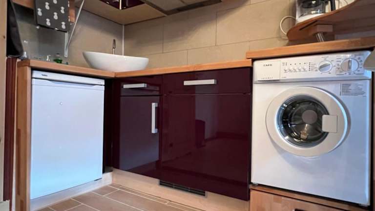 Die Ferienwohnung verfügt über ein Schlafzimmer und eine Küchenzeile, die mit einem Kühlschrank und einem Geschirrspüler ausgestattet ist. Ein Flachbild-TV und ein Sitzbereich sind ebenfalls vorhanden. Das Badezimmer ist mit einer Badewanne ausgestattet. Handtücher und Bettwäsche werden bereitgestellt.