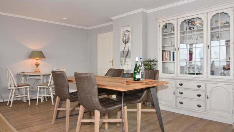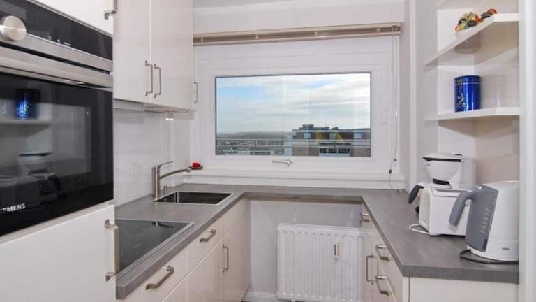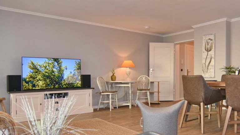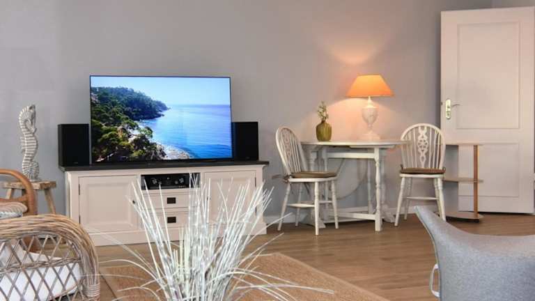 Die Ferienwohnung ist mit einem Wohnzimmer ausgestattet, das Platz für Erholung bietet. Die Küche verfügt über eine Vollausstattung inklusive Ofen und Toaster. Ein Fernseher steht ebenfalls zur Verfügung.