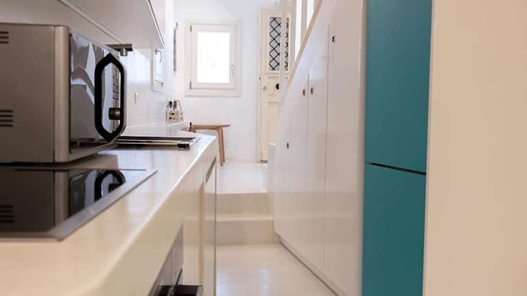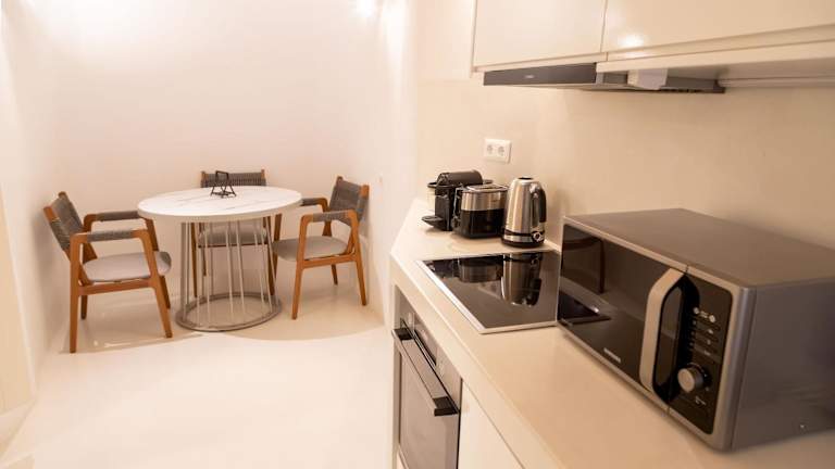 Die klimatisierten Wohneinheiten sind mit einer voll ausgestatteten Küche ausgestattet, die über einen Kühlschrank, eine Kaffeemaschine, einen Geschirrspüler, einen Ofen, eine Herdplatte und einen Wasserkocher verfügt.