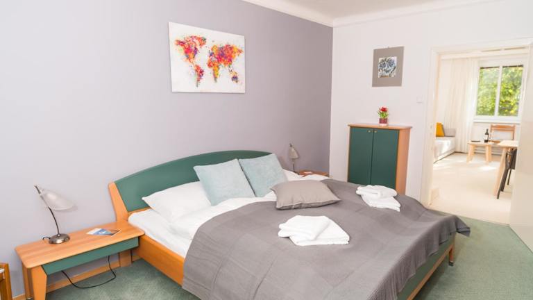 Das Apartment besteht aus einem Schlafzimmer, einem Wohnzimmer und einer voll ausgestatteten Küche. Das Schlafzimmer bietet Ihnen einen erholsamen Schlaf, während das Wohnzimmer einen gemütlichen Raum zum Entspannen bietet. Die Küche ist mit einem Kühlschrank und einer Kaffeemaschine ausgestattet, so dass Sie Ihre eigenen Mahlzeiten zubereiten können. Das Apartment verfügt auch über ein Badezimmer mit Dusche und kostenlosen Pflegeprodukten. Handtücher und Bettwäsche werden gestellt, um Ihren Aufenthalt so angenehm wie möglich zu gestalten.