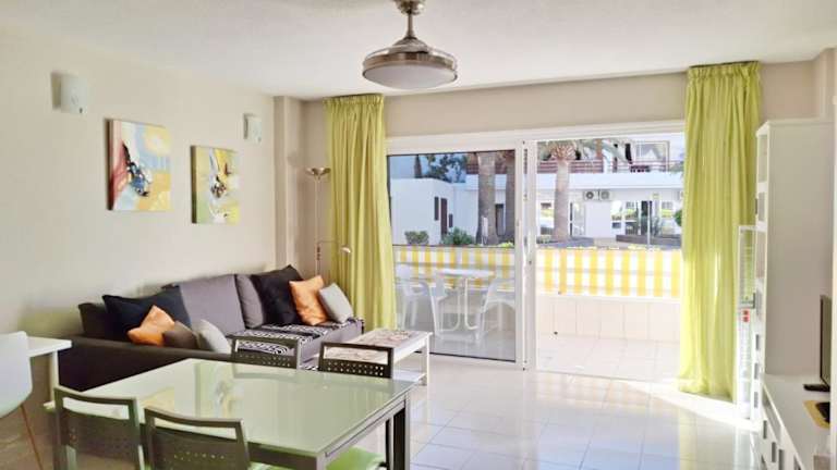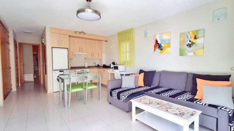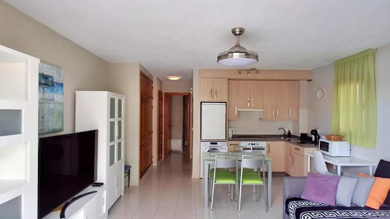 Die Ferienwohnung beinhaltet ein Schlafzimmer, eine Küche mit einem Kühlschrank und einem Ofen, einen Flachbild-TV, einen Sitzbereich sowie ein Badezimmer mit Dusche. Zur Ausstattung gehören zudem Handtücher und Bettwäsche. Der Balkon bietet einen Ausblick auf den Pool.
