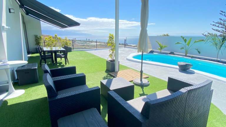 Tagoro Sunset View & Heated Pool Tenerife bietet einen Außenpool mit Blick auf die Berge und umfasst ein Ferienhaus mit 2 Schlafzimmern, einem Wohnzimmer und einer Terrasse mit Blick auf das Meer. Es stehen den Gästen ein eigener Pool und ein Garten zur Verfügung, sowie kostenfreies WLAN und ein kostenloser Privatparkplatz.