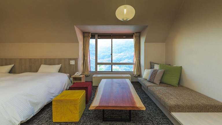 Die Zimmer im Hotel Jurin sind im traditionellen japanischen Stil gehalten und bieten eine einladende Atmosphäre. Die Zimmer verfügen über Tatamiböden aus gewebtem Stroh, traditionelle Futonbetten und einen Sitzbereich mit Stühlen und einem Couchtisch. Es gibt auch Zimmer mit Teppichboden, Betten und einem Sofa. Alle Zimmer sind mit einem LCD-TV, einem Kühlschrank und Yukata-Roben ausgestattet.