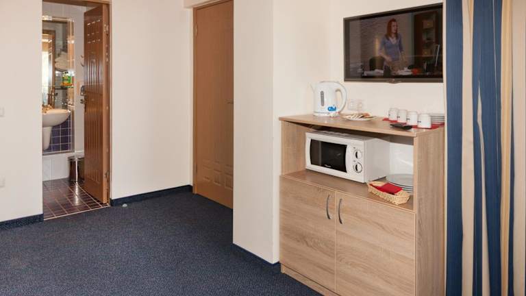 Die Zimmer sind mit einem Kleiderschrank, Flachbild-TV, einem eigenen Bad sowie Bettwäsche und Handtüchern ausgestattet. Jeder Raum verfügt über einen Wasserkocher und einen Kühlschrank. Einige Zimmer sind mit einer Küchenzeile, einschließlich einer Mikrowelle, ausgestattet.