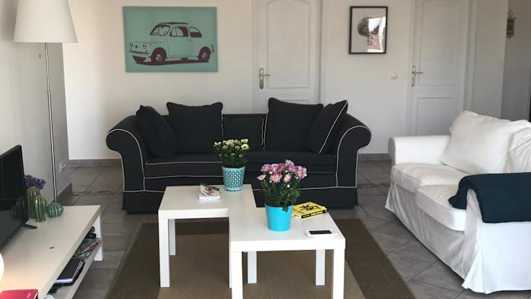 Die Ferienwohnung umfasst zwei Schlafzimmer, ein Wohnzimmer und eine voll ausgestattete Küchenzeile mit Kühlschrank und Kaffeemaschine. Darüber hinaus gibt es zwei Badezimmer, die mit einem Bidet und einer Dusche ausgestattet sind. Handtücher und Bettwäsche werden bereitgestellt.