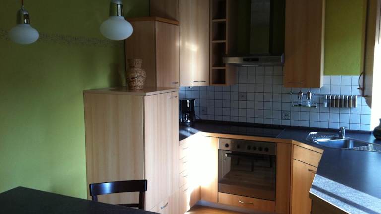 Die Ferienwohnung bietet ein Schlafzimmer sowie eine Küche, die mit einem Kühlschrank, einem Ofen und einer Kaffeemaschine ausgestattet ist. Handtücher und Bettwäsche werden bereitgestellt.
