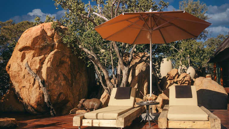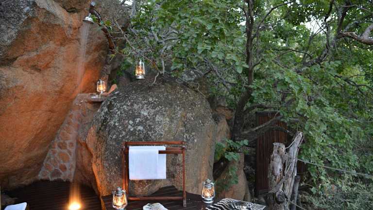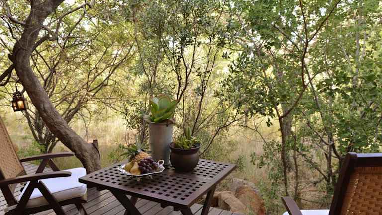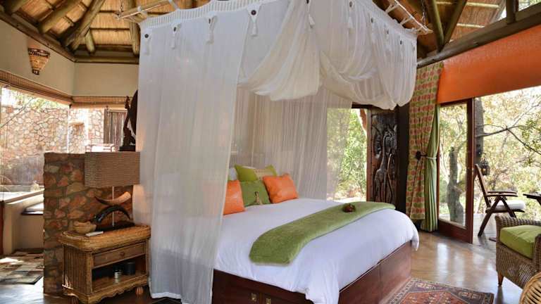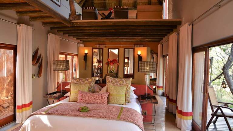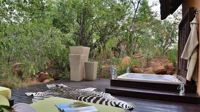 Die Chalets sind klimatisiert und bieten eine Terrasse oder einen Balkon mit Panoramablick auf den Busch oder die Bergkette des Waterberg. Jedes Chalet ist mit einer Badewanne oder einem Whirlpool ausgestattet.