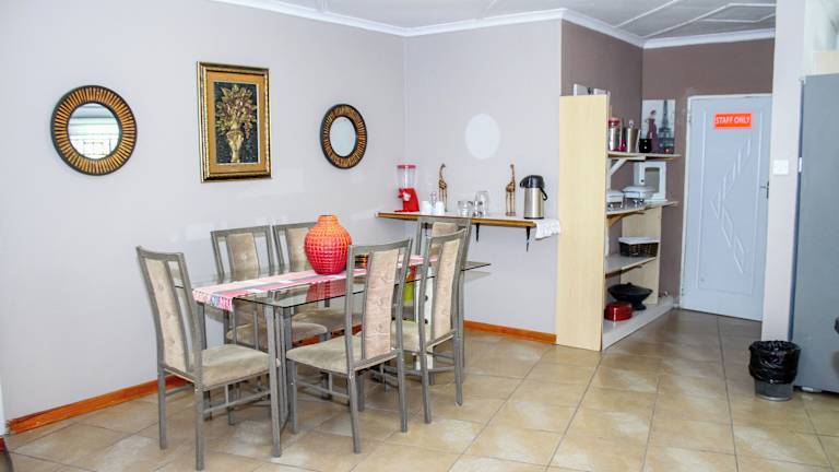 Die Pension Thamalakane bietet eine Gemeinschaftsküche, in der die Gäste ihre eigenen Mahlzeiten zubereiten können. Es gibt auch Grillmöglichkeiten im Garten, ideal für ein gemütliches Barbecue. In der Nähe gibt es auch Restaurants und Cafés, in denen die Gäste lokale Spezialitäten und internationale Gerichte genießen können.