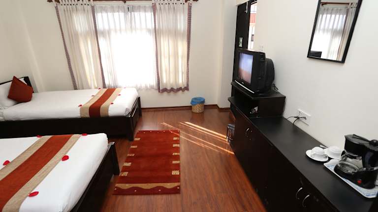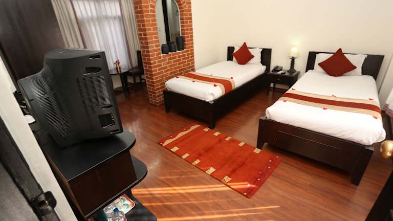 Die Zimmer im Thamel Eco Resort sind klimatisiert und verfügen über Parkettböden. Sie sind einfach eingerichtet und bieten Annehmlichkeiten wie einen Kleiderschrank, Kabel-TV, ein Telefon und einen Sitzbereich. Jedes Zimmer verfügt über ein eigenes Badezimmer mit Dusche.