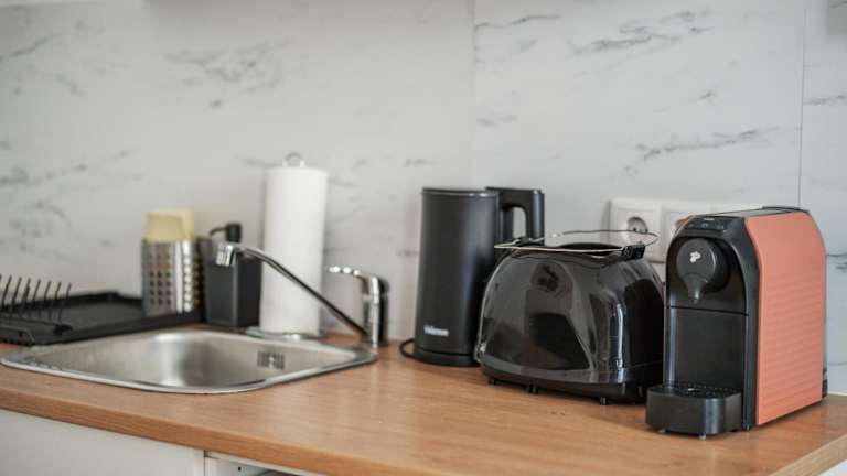 Die Unterkünfte sind mit einer voll ausgestatteten Küche ausgestattet, die einen Kühlschrank, einen Ofen, eine Herdplatte, einen Toaster, eine Kaffeemaschine und einen Wasserkocher beinhaltet.