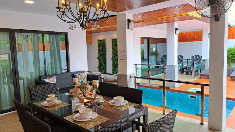 The Chic Pool Villa bietet Übernachtungsmöglichkeiten mit Poolblick, einer Terrasse und einem Balkon. Die Villa verfügt über einen eigenen Pool, einen Garten und einen kostenlosen Privatparkplatz. Es handelt sich um eine klimatisierte Unterkunft mit angrenzenden Wohnbereichen.