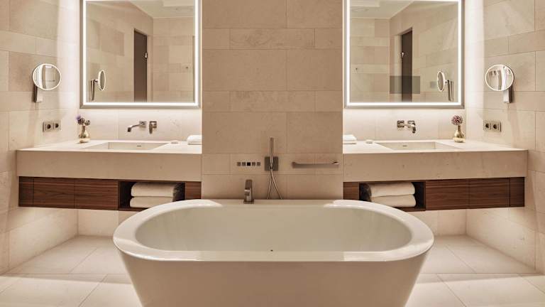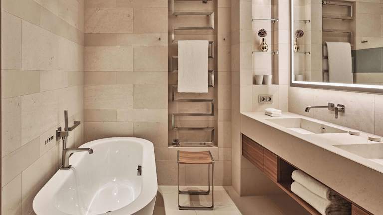 Die aus Kreisen abgeleitete skulpturale Architektur des Gebäudes findet sich in besonderer Weise auch im Raumkonzept wieder: Der trapezförmige Grundriss, die halbrunden Wände und die große Panoramafront aus bodentiefen Fenstern eröffnet lichtdurchflutete Freiräume, die Natur wird Teil des Wohngefühls und der Blick kann in die Weite schweifen. Dazu eine Deckenhöhe von 2,85m, die das Zimmer auch nach oben großzügig erweitert. Ab der Deluxe Zimmerkategorie schenkt ein privater Balkon mit fünf Quadratmetern Fläche zusätzlich Platz.