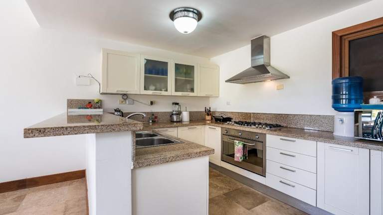 Die Villa besteht aus 3 separaten Schlafzimmern, einer voll ausgestatteten Küche mit Kühlschrank und Geschirrspüler sowie 4 Badezimmern. Ein Fernseher ist ebenfalls vorhanden.